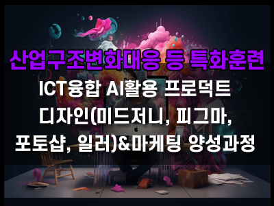 | 과정명 | (산대특)ICT융합 AI활용 프로덕트디자인(미드져니,피그마,포토샵,일러)&마케팅 양성과정_육성산업 (전액무료) [진행중] |